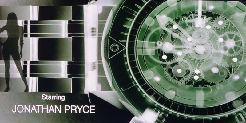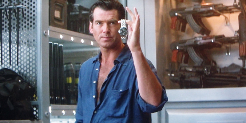 Tomorrow Never Dies (1997年/主演:ピアース・ブロスナン) トゥモロー・ネバー・ダイ オメガ シーマスタープロフェッショナル 2531.80 登場シーン解説 ![]() この特殊機能を備えた時計は、終盤でウェイ・リン(ミシェル・ヨー)のセーフハウス(秘密のアジト)で調達する。 多数の武器が並んでいるところから、ボンドはこのシーマスターを取り上げ(2時55分ぐらいを指している)、「見覚えがある」と言う。 そこでウェイ・リンは「改良型よ」(Improvement)と言う。中国情報部によって改造されたシーマスターということだろうか。 しかし私は「イギリス情報部の支給品説」も考えられると思う。それは、同じ部屋でワルサーP99を見つけてボンドは「Qに頼んでいたやつだ」というのである。 (そのとき意味深なやりとりがある) これが事前にイギリスから届けられた物ということをほのめかす描写であれば、 そのシーマスターもQが作ったものと考えることができる。残念ながら詳細は不明だ。 シーマスターを取り上げたボンドは3回ほどリューズを巻いただけで胸ポケットにしまっている。 画面では他にもカルティエのサントスや金無垢のタグ・ホイヤーのような時計が確認できる。 またコンビでジュビリーブレスのロレックスのような時計もあるが、文字盤やベゼルなどからみてパチモノか? ボンドは他のものには目もくれずシーマスターだけを取っているというのも興味深い。 他に作品を通して気になる点としては中盤でのシーマスターの行方だ。ボンドが米軍基地で海軍の制服を着ているシーンではシーマスターをしているが (スカイダイビング(HALOジャンプ)と水中のシーンではしているかどうか不明である)、その後、ウェイ・リンと捕まって手錠で繋がれているときには(手錠がジャマなのか)つけていないので、 どこかで外したようだ。おそらくはスタンパーたちに捕まってヘリで移動するときに没収されたのかもしれない。 その後で前述のとおりウェイ・リンのセ−フハウスで新しいシーマスターを調達するわけで、 作品中では2つのシーマスターを使用していたことになるという点にも注目しておきたい。 ![]() ![]() 肝心の特殊機能だが本作も前作同様、起爆装置としての役割にとどまった。ただ『ゴールデンアイ』のように特殊な爆弾に 信号を送るものと違い。手順がやや面倒だ。ビンに手榴弾を入れて、シーマスターのヘリウムエスケープバルブの周辺を外したものと 「雷管(起爆剤)のようなもの」をテープで巻きつける。そして時計本体からの遠隔操作によりビンが割れるという仕組みだ。 したがってその時計の一部分には遠隔操作でビンを割る程度の力しかないようだ。ボンドはカーヴァーのステルス艦の弾薬庫(?)でそのビンのようなものと手榴弾を調達するのだが、 もしどちらか手に入れられなかったら時計が活躍することもなかったし、ボンドの命も危ういところだったろう。 ベゼルを数目盛りずらすとインデックスの外周が青白く光り(カッコイイ!)、手榴弾をセットしたガラスのビンが割れる。 機械式というのに、LEDを点灯させたり、遠隔操作できる電力が供給されるのは不思議!といってもあまり魅力的な機能とはいえないのが残念である。 なお、シェリル・クロウが歌う主題歌のバックではシーマスターのX線映像も見ることができる。ちゃんと機械式の針の動きをしているのもわかる。 ![]() 時計解説